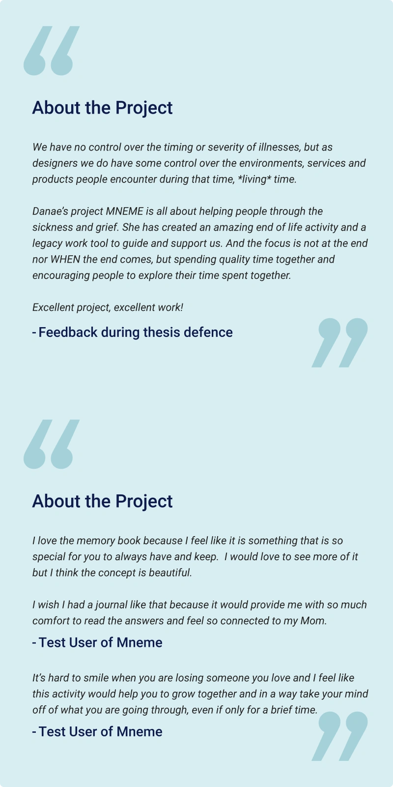 My solution, MNEME, is an end of life activity consisting of a set of illustrated cards that help reflect on life and memories through associations, and of a memory book to create a physical representation of the memories.