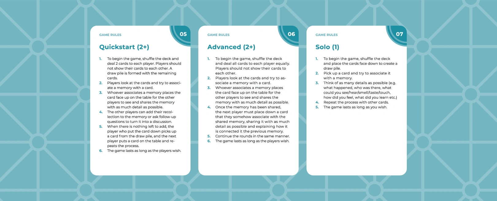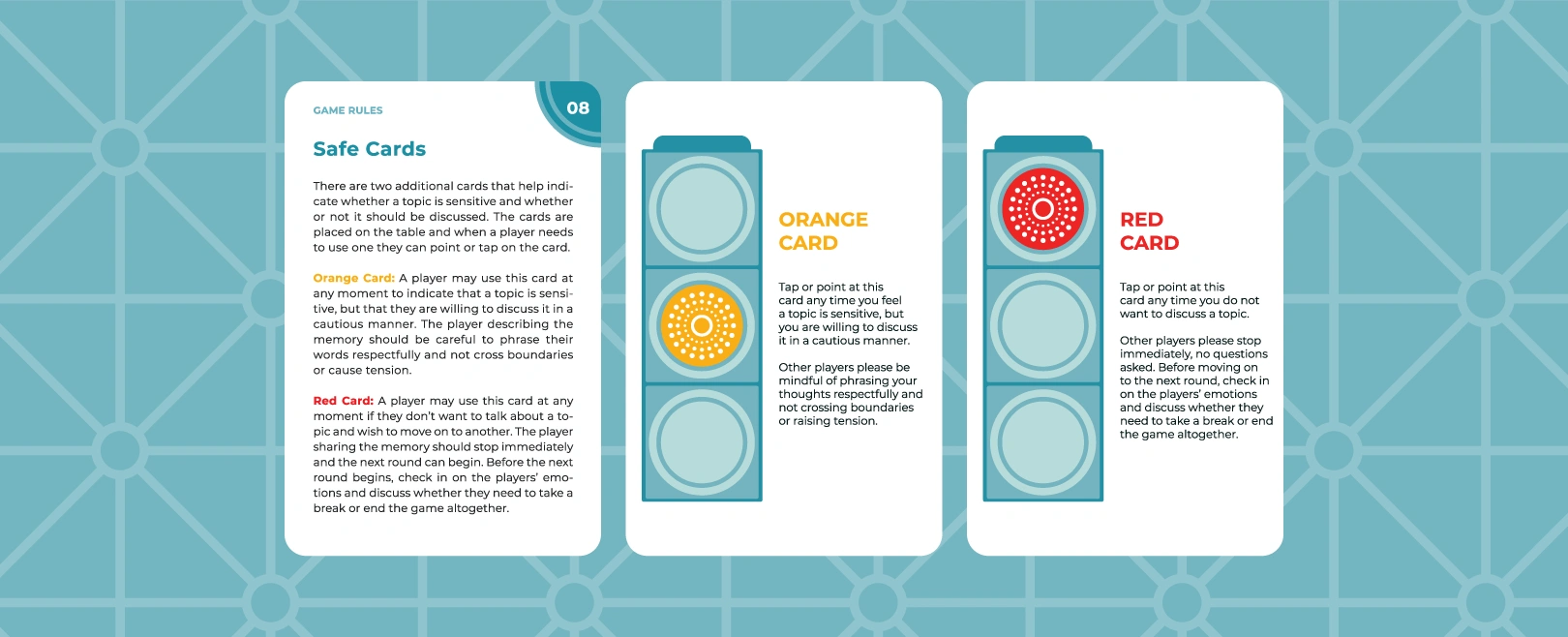 The card deck includes four introductory cards (explaining the game and its purpose, and giving a brief overview of how to use the cards and memory book), four game rule cards, two safety cards, and illustrated cards which are used to inspire discussion.