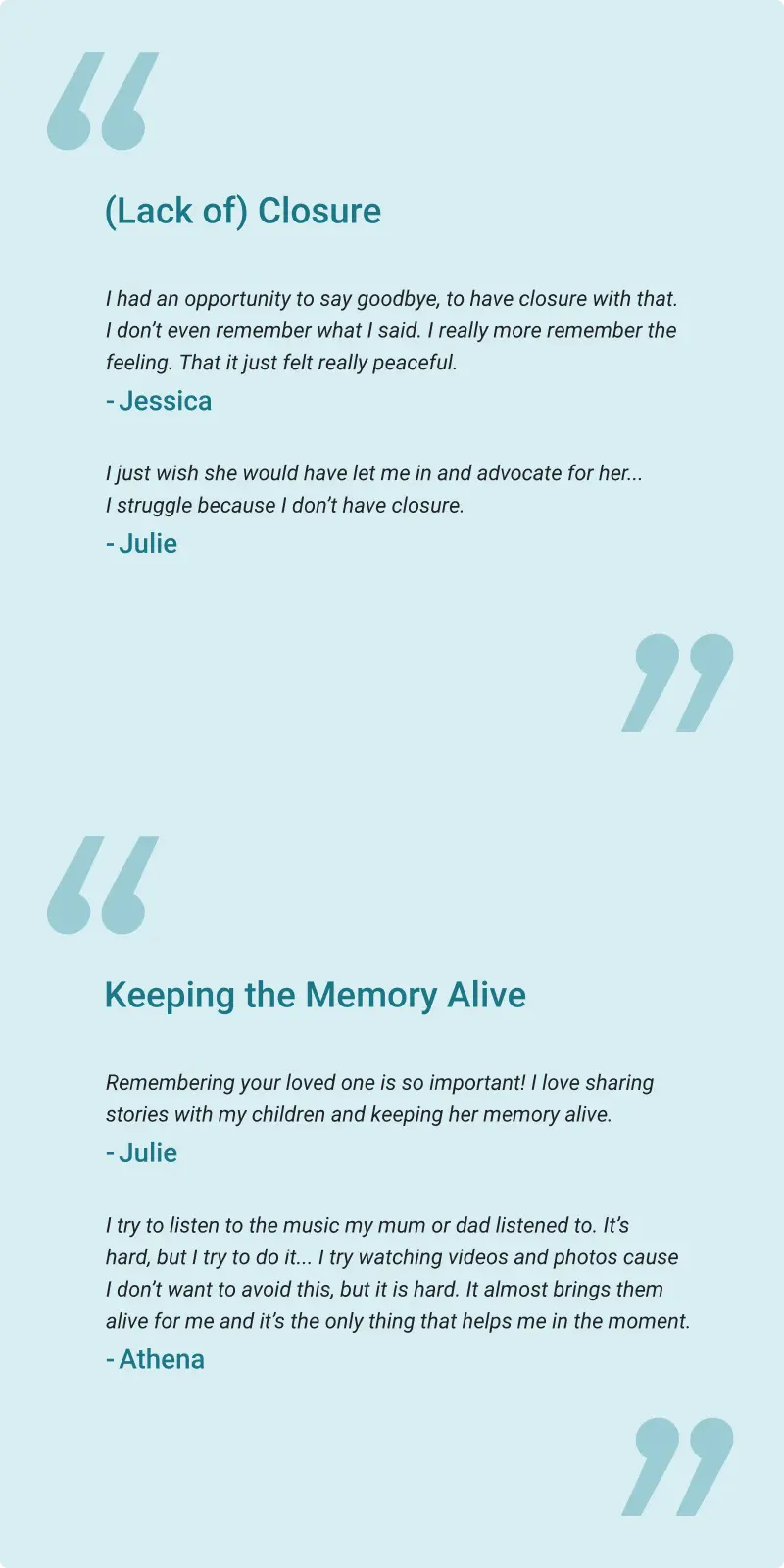 From the narrowed topic, I defined my target audience and conducted five interviews with the bereaved. This was followed by a questionnaire to validate insights and gather diverse perspectives.