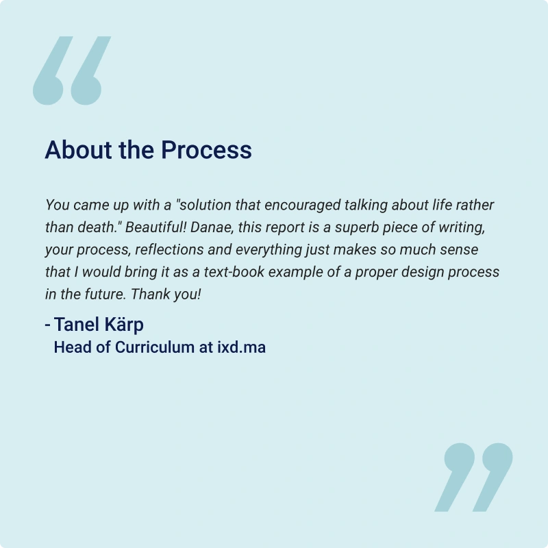I started with desk research to grasp the basics of grief and reviewed existing design solutions. Then, I conducted four interviews with experts to narrow down my topic.