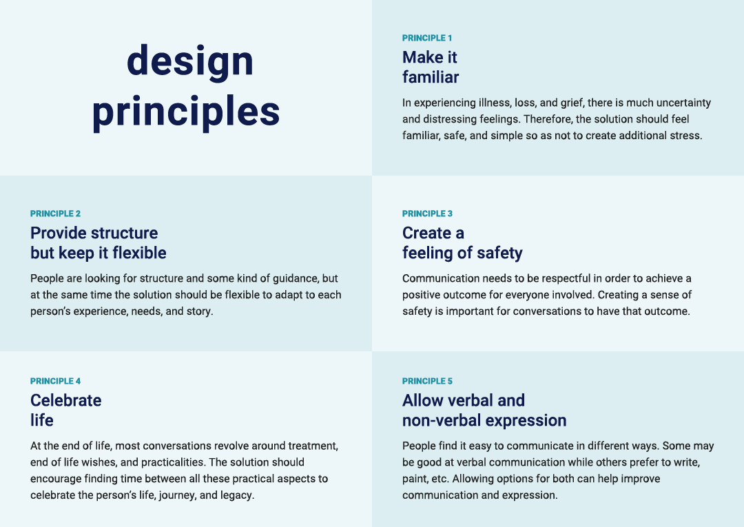 It provides a starting point and structure for talking about memories, while co-creating tangible, visual representations that can be kept as keepsakes after the loved one’s death. It encourages people to explore their time spent together in a way that could bring a sense of peace and closure to the grieving process.